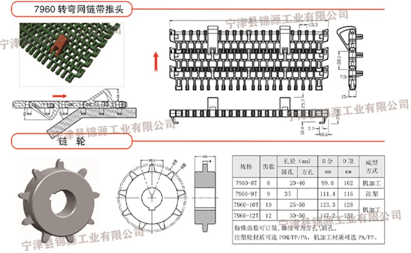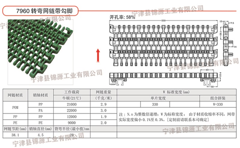 7960轉彎塑料網帶專業適用于各種肉類加工、食品、大型殺菌機、大型儲瓶臺等行業。