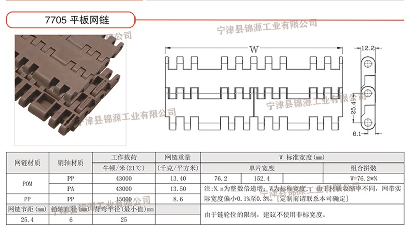 塑料網帶由鏈輪驅動,網帶節距主要有12.7mm、15.2mm、19.05mm、25.4mm、27.2mm、38.1mm、50.8mm、57.15mm,開孔率2%-48%